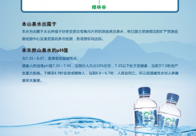 綠林谷飲用天然泉水為出露于太古界城子坦組老變質(zhì)巖中的深層承壓水, 富含偏硅酸、鍶、鉀、鈉、鈣、鎂、鐵、氟、鋅、銅、鉻、錳等微量元素。其中:偏硅酸(H2SiO3)達25.0㎎/L以上,鍶(Sr)達0.2㎎/L以上,達到國家天然礦泉水標(biāo)準(zhǔn);適合人體所需礦物質(zhì)含量適中(其中鈣、鎂合量≥8㎎/L),本天然泉水鈣含量35.3㎎/L、鎂含量8.09㎎/L、合量達43.39㎎/L,非常理想是價廉物美的天然補鈣劑;適合人體飲用水的總硬度(以CaCO3計,30~300㎎/L),本天然泉水的總硬度123㎎/L,正介于其中;pH值7.35~8.07,屬于典型的弱堿性水。